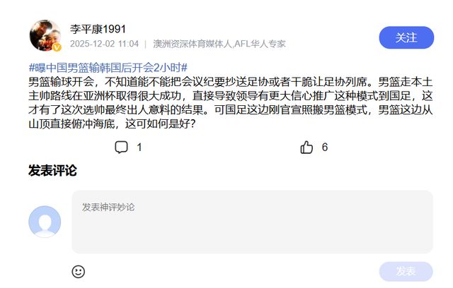 據悉,在中國男籃再次輸給韓國隊之后,籃協負責人召集男籃將帥在更衣室開會,時間超過兩小時,比打比賽時間還要長。對此,媒體人李平康在社交媒體發文:“男籃輸球開會,不知道能不能把會議紀要抄送足協或者干脆讓足協列席。男籃走本土主帥路線在亞洲杯取得很大成功,直接導致領導有更大信心推廣這種模式到國足,這才有了這次選帥最終出人意料的結果。可國足這邊剛官宣照搬男籃模式,男籃這邊從山頂直接俯沖海底,這可如何是好?”