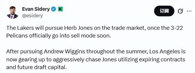 北京時(shí)間12月11日,據(jù)NBA名記Sidery報(bào)道,一旦目前戰(zhàn)績(jī)僅為3勝22負(fù)的鵜鶘隊(duì)正式開(kāi)啟甩賣模式,湖人便會(huì)在交易市場(chǎng)上追求赫伯特-瓊斯。經(jīng)過(guò)休賽期對(duì)維金斯的持續(xù)追逐后,湖人如今正籌備利用到期合同和未來(lái)選秀權(quán),全力出擊追逐瓊斯。