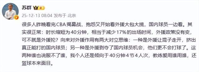 隨后,蘇群老師還給出了新的方向,“向來對外援作用有兩大對立思維:一種是外援讓混子走開,擠出真正能打的國內球員;另一種是外援剝奪了國內球員機會,他們更不會打球了。這兩種誰也說服不了誰,我個人還是傾向于40分鐘4節4人次,教練愛用誰用誰,還籃球本來面目。”