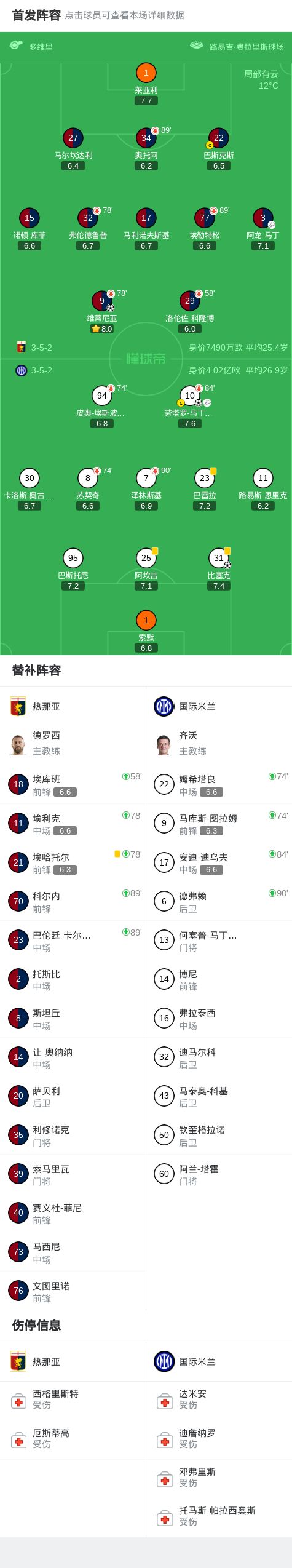 北京時間12月15日1:00,意甲第15輪繼續(xù)進行,國際米蘭作客費拉里斯球場挑戰(zhàn)熱那亞,本場主裁判為多維里。上半場,比塞克內(nèi)切低射閃擊,勞塔羅傳射建功。下半場,維蒂尼亞為熱那亞扳回一城。最終,國米2-1客勝熱那亞,聯(lián)賽登頂。